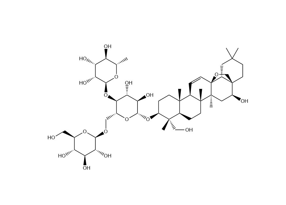 【英文別稱】 [16β,28-Dihydroxy-11,12,13,18-tetradehydrooleanan-3β-yl]4-O-(6-deoxy-α-L-mannopyranosyl)-6-O-(β-D-glucopyranosyl)-β-D-glucopyranoside